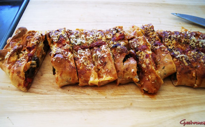 Deja algo de salsa de tomate para dipear, verás como se ‘evapora’ todo en pocos minutos. No es necesario hacer las tiras de masa entrelazadas, es un toque puramente estético, puedes simplemente cubrirlo con la masa o enrollarlo para que quede con forma ‘tubular’, puedes rellenarlo de lo que más te guste, como si de una pizza se tratase, si quieres hacer solo un Stromboli, usa exactamente la mitad de los ingredientes.